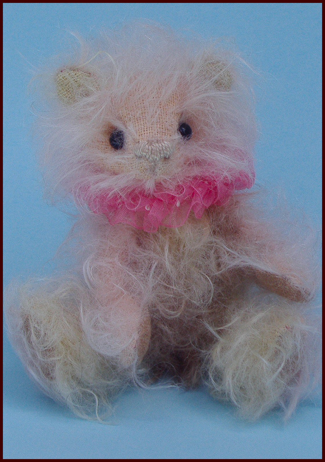Carly is a sweet little teddy who is holding her toy Kitty. Her toy kitty has an embroidered face and is made of cotton. The tiny floral print match's Carly's antique apricot color. Carly is 13"tall and is made of mohair. She has velvet paw pads and a brown embroidered nose. Carly is $150 Please email me if you are interested in adopting Carly.